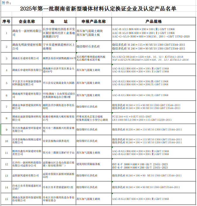 附件:2025年第一批湖南省新型墙体材料认定换证企业及认定产品名单