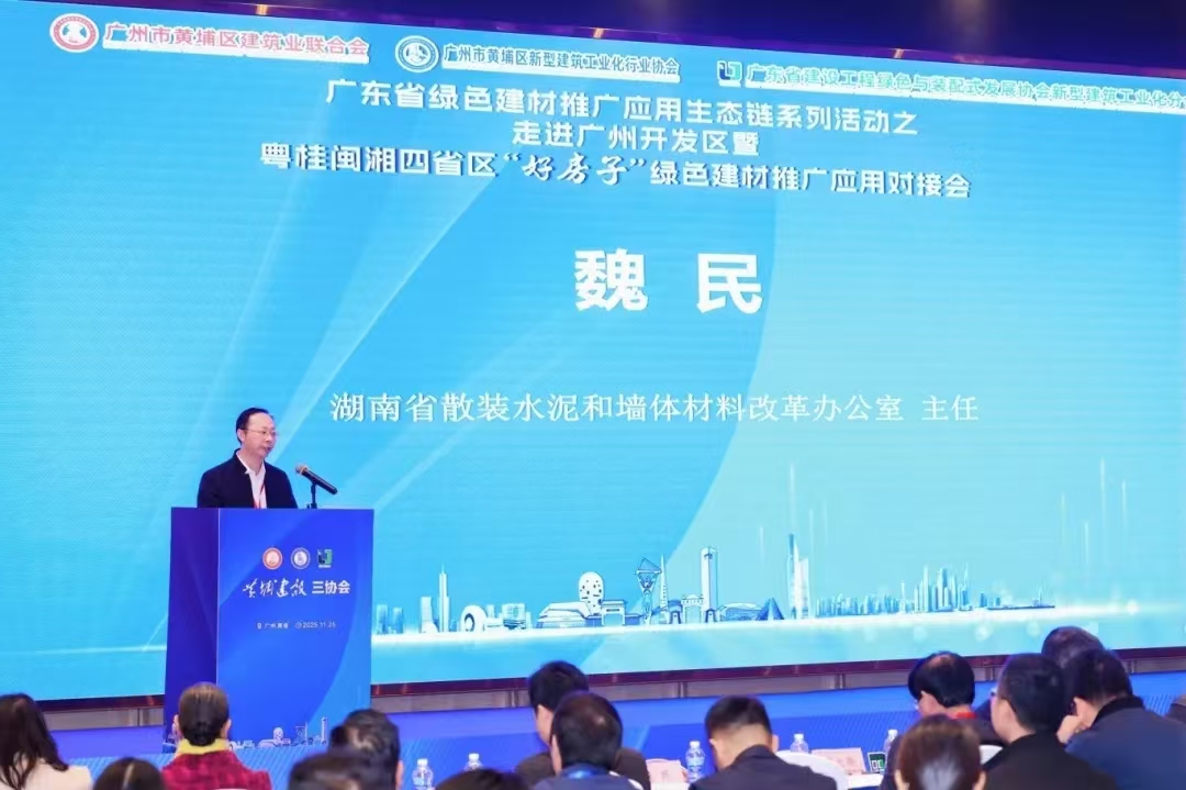 2025年11月25日,粤桂闽湘四省区“好房子”绿色建材推广应用对接会在广州举办。本次活动以“用好材料,建好房子”为主题,由四省区散装水泥和墙体材料管理部门联合相关行业协会共同主办,近200名代表参会。湖南省散装水泥和墙体材料改革办公室组织省内绿色建材企业及检测机构参加。