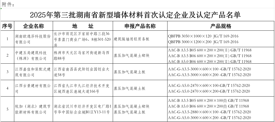 附件:2025年第三批湖南省新型墙体材料首次认定企业及认定产品名单