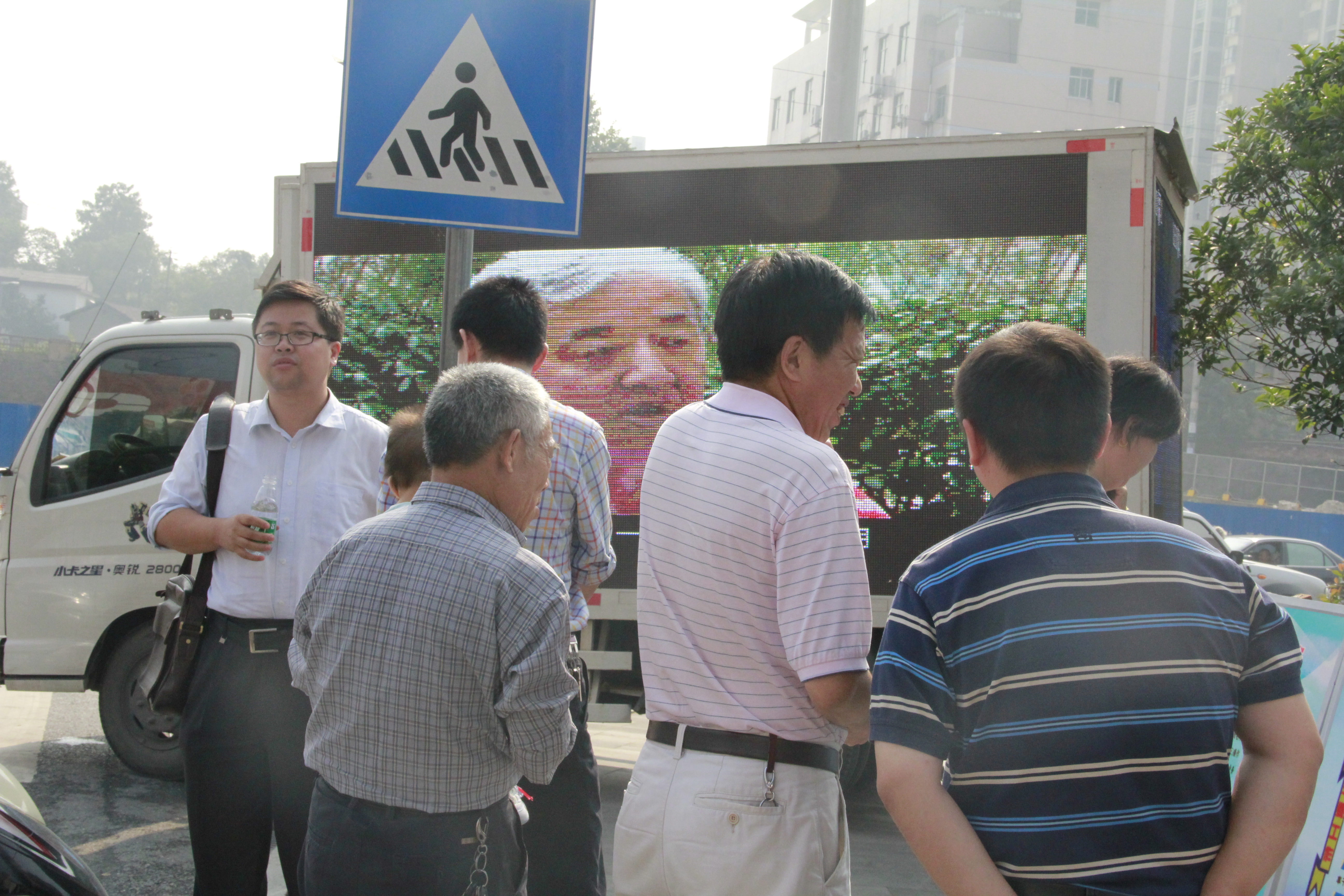移动大屏幕广告车循环滚动播放《电波卫士无线服务》宣传光盘,现场展示移动监测测向车