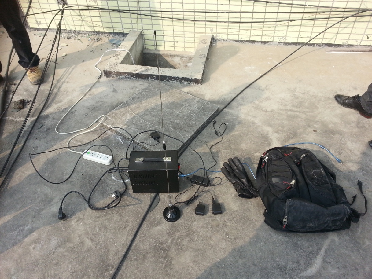 1月4日,湘西州管理处根据统一部署,提前半小时赶到各考点,实施监测部署。上午考试进行到近一半时,市民族中学考点监测人员发现一个异常信号,根据信号特征和经验判断,可能是作弊信号。工作人员立即启动应急预案,调集2台移动监测车实施监测定位。很快,技术人员将信号锁定在考点边的某居民小区。小区内高楼林立,技术人员结合手持监测设备,进一步将信号锁定在其中一栋18层楼的高层部分。技术人员决定先到楼顶作进一步测试。在通过电梯来到顶层时,越来越强的信号突然消失,楼顶传来说话声。技术人员立即意识到作弊信号源就在楼顶。执法人员迅速接近楼顶,发现2名作案人员从另一楼梯口仓皇逃跑,现场丢下一套作弊设备。目前,公安人员正通过小区监控做进一步调查处理。