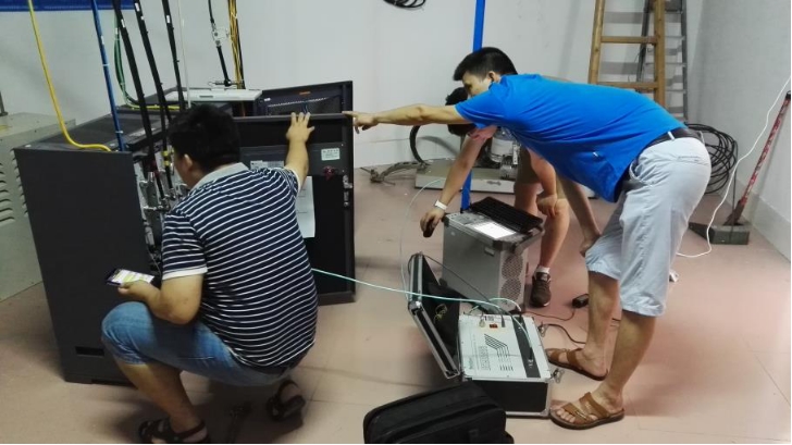 工作人员连接基站发射设备进行检测