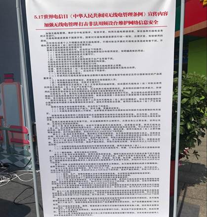 在株洲电信营业大楼前坪,“加强无线电管理、打击非法用频设台、维护网络信息安全”,“5.17”世界电信日《中华人民共和国无线电管理条例》等展板吸引了许多来往的市民的目光。