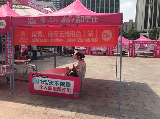 在市移动公司门前,“设置使用无线电台(站)应当向无线电管理机构申请取得无线电台执照”、“使用无线电频率应当取得许可”,《无线电管理条例》等宣传标语在几个宣传点同时联合开展。