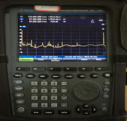 12月3日,邵阳市无管处及市文管新局干扰联合排查小组(以下简称排查小组)按照预先研究的方案,赴邵东仙槎桥、野鸡坪镇进行实地监测排查。在仙槎桥镇马路村,排查小组发现该村“村村响”设备使用的频率为67.3MHz,但是由于设备性能不佳,当开机发射后,在1XX.6MHz立即出现一个谐波信号,刚好与航空通信使用的频点相同,严重干扰了航空通信的正常使用。在野鸡坪镇黄泥塘村,排查小组发现该村“村村响”设备同样存在干扰航空频段的情况,且由于设备存在技术故障,谐波的干扰电平值现场测试达到70dBμV,给航空安全带来了严重隐患。随后,排查小组又赶赴新邵县,对雀塘镇、棉花塘镇村村响设备进行了测试,同样存在谐波发射问题,但由于使用的频率没有落在相关频段内,暂时没有出现干扰航空通信的情况。