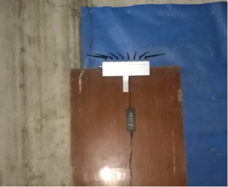 接到投诉后,市无线电监测站立即启动无线电干扰排查预案,派出排查小组携带监测设备驱车前往现场实地排查,根据移动公司技术人员前期排查经验,排查小组将受干扰最严重的区域作为排查重点。排查过程中,技术人员在雨湖区先锋街道金塘村附近发现860-970 MHz频段底噪明显抬升,扩展监测频率范围发现在1.2GHz、1.8GHz、2.1GHz、2.5GHz等多个频段有干扰信号。经反复测向定位,最终定位干扰源位于某仓库院内。排查小组在现场发现该院门卷闸门紧锁,窗户玻璃全部用箱纸裱糊,无法观察室内情况。
