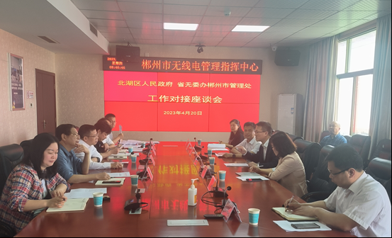 2023年4月20日,郴州北湖区委副书记、区长蒋慧亮同志一行来到省无委办郴州市管理处开展工作对接,就郴州中波台迁建选址有关事项进行座谈。市工信局党组书记、局长张社军主持座谈会。省无委办郴州管理处主任邓正毅、北湖区副区长何蔚、何翊斌,郴州中波转播台、市工信局无线电管理科、市无线电监测站、区文旅广体局、区科工局有关负责人参加座谈。