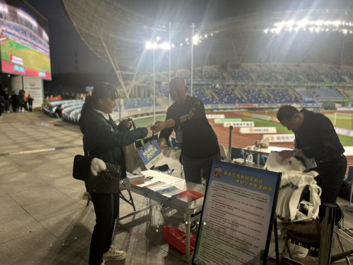 11月,宣传活动借力赛事热度实现“精准触达”。在湘超岳阳主赛区现场,工作人员通过发放宣传资料、赠送定制手袋等接地气的方式,向观赛群众普及《中华人民共和国无线电管理条例》核心内容,讲解“黑广播”“伪基站”的危害及识别方法 ,借助赛事的广泛影响力凝聚社会共识,呼吁各界共同维护电磁空间秩序。