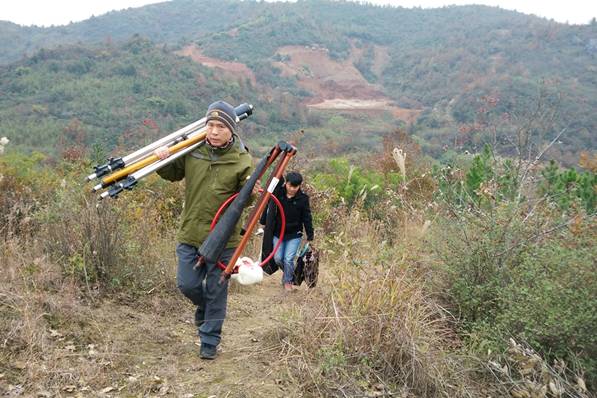 测试人员扛着测试设备爬上马塘选址山顶测试点