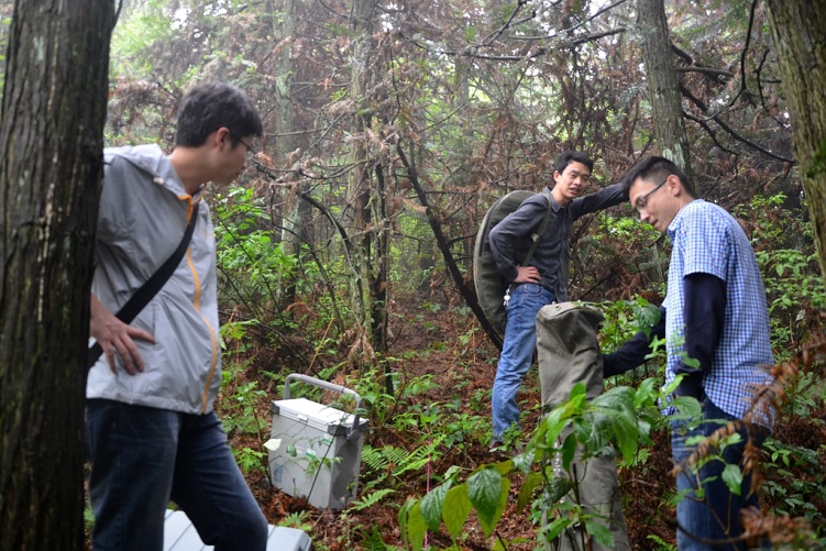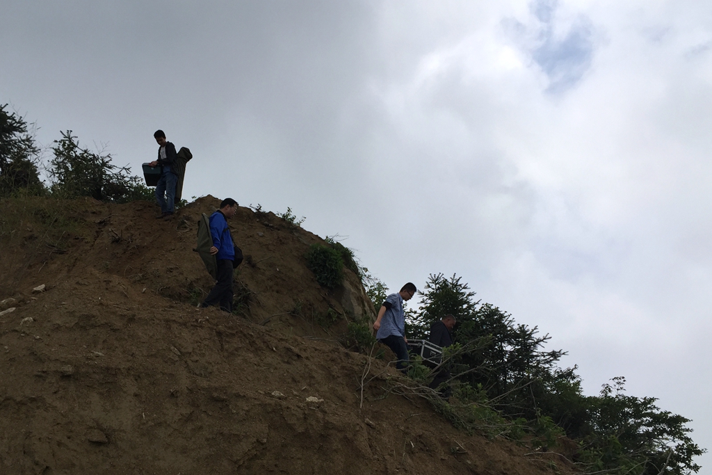 扛设备爬山途中小憩,测试人员已满头大汗。山上本来没有路,大家一边探路一边前行