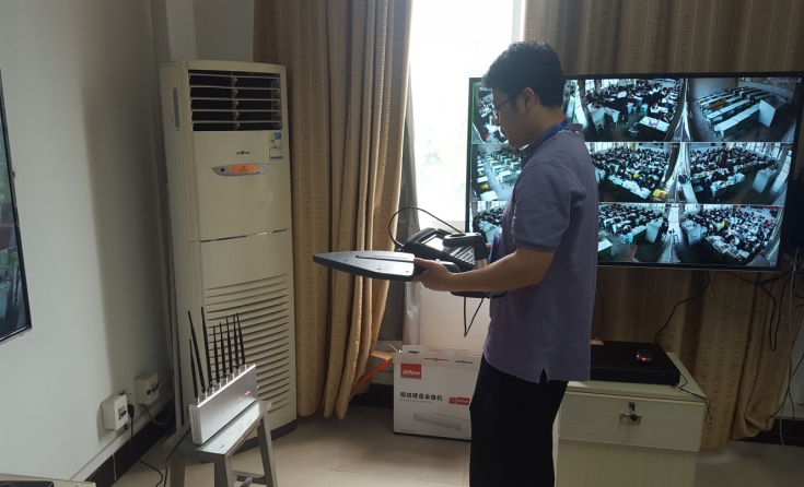 图为工作人员正在测试考点手机信号屏蔽器
