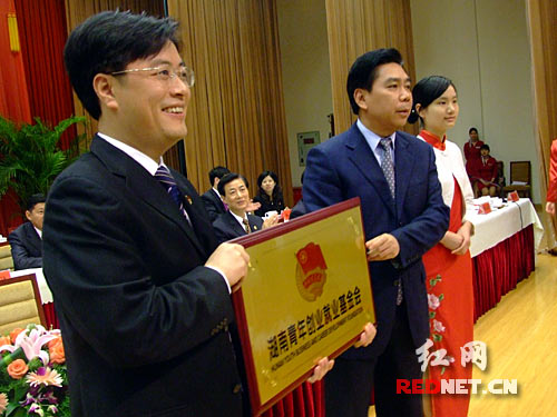 (湖南省委常委、副省长徐宪平(右)和共青团湖南省委书记张值恒为湖南青年就业创业基金会授牌。)