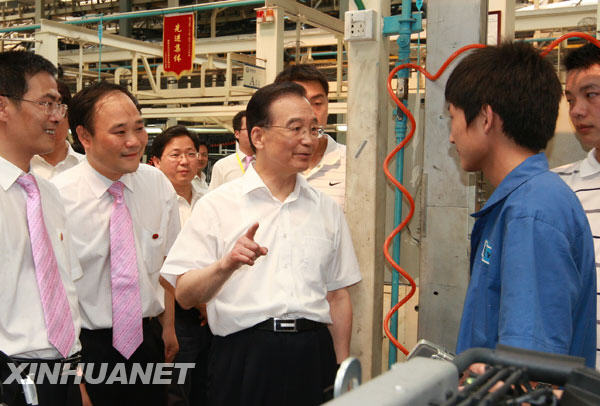 这是6月13日,温家宝在湖南吉利汽车部件有限公司同一线职工亲切交谈。新华社记者鞠鹏摄