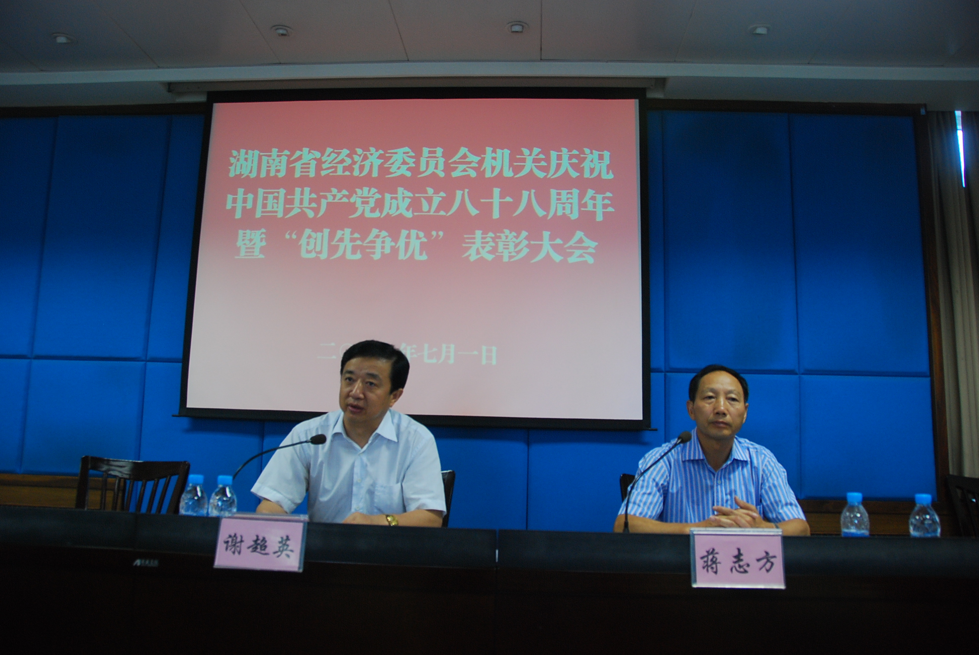 7 月 1日下午,省经委 召开庆祝中国共产党成立八十八周年暨 “ 创先争优 ” 表彰大会,会上表彰了获得机关 2009 年度 6 个 “ 先进党支部 ” 和 22 名“优秀共产党员 ” ,并为先进 集体和个人授牌,颁发了证书。委党组书记、主任 谢超英同志在会上为大家上了一堂题为《加强干部党性修养,全面提高行政能力,着力推动经委机关各项工作迈向新台阶》的党课。