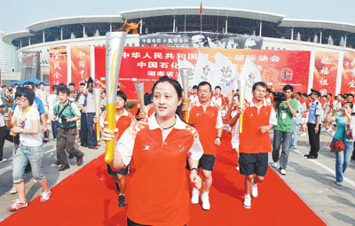 湖南日报9月5日讯(记者 邓晶? 通讯员 李顶呈)今天上午,长沙贺龙体育场欢声雷动、人声鼎沸、热闹非凡。第十一届全国运动会中国石化杯火炬传递活动湖南火炬传递起跑仪式在此隆重举行。省人大常委会主任、省委书记张春贤点燃主火炬,省委常委、长沙市委书记陈润儿致辞,副省长刘力伟主持起跑仪式。