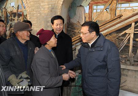 一场大雪过后,雁北大地天寒地冻。贫困地区农民生活怎样、能否安稳过冬,李克强十分牵挂。一下飞机,他就直接赶往大同县倍加灶镇营坊沟村,走访看望贫困农民。这个村子受土地贫瘠、天气干旱等影响,部分群众生活还很困难。李克强冒着零下十几度严寒,踏着积雪,逐户探访。在83岁的老党员、老支书蒙品简陋的屋里,李克强与一家人围坐在一起,促膝交谈、嘘寒问暖。他还亲自打开面缸查看存粮,手摸炕头感受烧得热不热。李克强拉着老人的手说,作为老党员、老支书,你为村里和乡亲们出了不少力、做了不少事,现在生活还不富裕,我们有责任帮助你过上好日子。农户蒋五毛因为年景不好,每亩地只打了百来斤玉米。李克强走进他家,详细询问粮食够不够吃,过冬物品准备得怎么样,生活上还有什么困难,并叮嘱当地干部,把因旱减收的群众生活安排好,帮助农民改造危房,使他们吃得饱、穿得暖、住得安,逐步能致富。见到闻讯赶来的村民,李克强走上前去一一握手,拉起家常。他强调,要深入基层,访贫问苦,体察民生,从解决群众最基本的生活问题入手,切实为民解忧,为民办事,为民造福。
