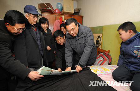 位于大同市老城区的鼓楼东街棚户区,居住的多为下岗失业和享受低保的困难群众。夜幕降临,寒风更加刺骨,李克强沿着狭窄不平的过道,进院入户,实地查看群众居住条件和生活状况。在碗柜前、餐桌边、床铺旁,他详细询问一日三餐。薛丽丽一家四口挤在一间简陋的小屋里,紧邻床头就是做饭的灶台。李克强看了神色凝重,嘱咐在烧煤做饭取暖时,注意防火安全,防止烟气泄漏。从全家收入来源,到低保补助多少,看病报销比例,他一一询问。得知这片棚户区即将改造,李克强说,这是你们多年的期盼,我们与你们一样高兴,祝你们早迁新居。