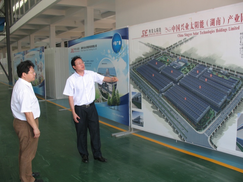 兴业太阳能 (湖南)产业园由中国兴业太阳能技术控股有限公司投资建设,重点建设光伏建筑一体化生产基地、太阳能电池及组件、光伏光热联产组件、ITO Film、智能微电网及LED等项目,计划总投资20亿元。其中20.8MW屋顶电站项目2010年已列入国家“金太阳示范工程”,建成投产后年发电量2500万度,将成为国内规模较大的屋顶电站示范项目。目前,已建成2MW 的1.5 万平方 米电池片, 可 年发电180万度。预计今年将完成13MW的建设任务。
