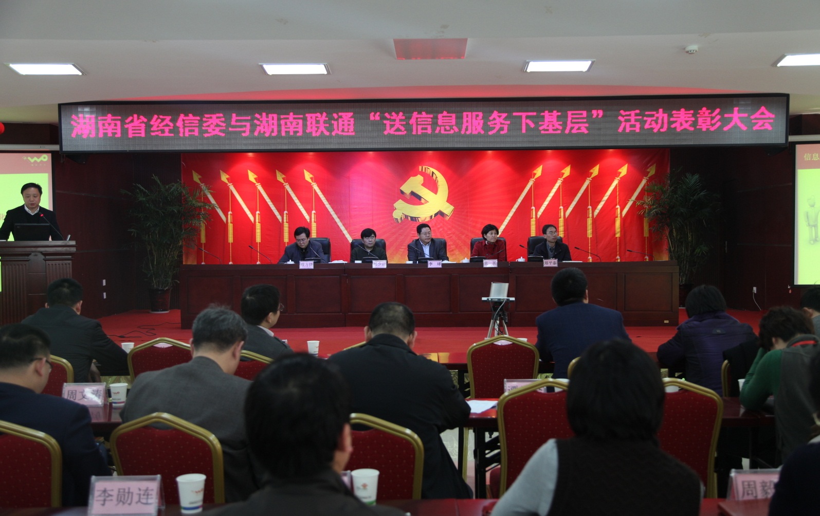 1月 25日,省经济和信息化委员会、湖南联通公司联合召开了2012年度“送信息服务下基层”活动表彰大会,会议设主会场和市州分会场。省经济和信息化委员会副主任李球、湖南联通公司副总经理黄英出席长沙主会场会议。14个市州经(工)信委领导、联通分公司负责人在各地分会场参加会议。