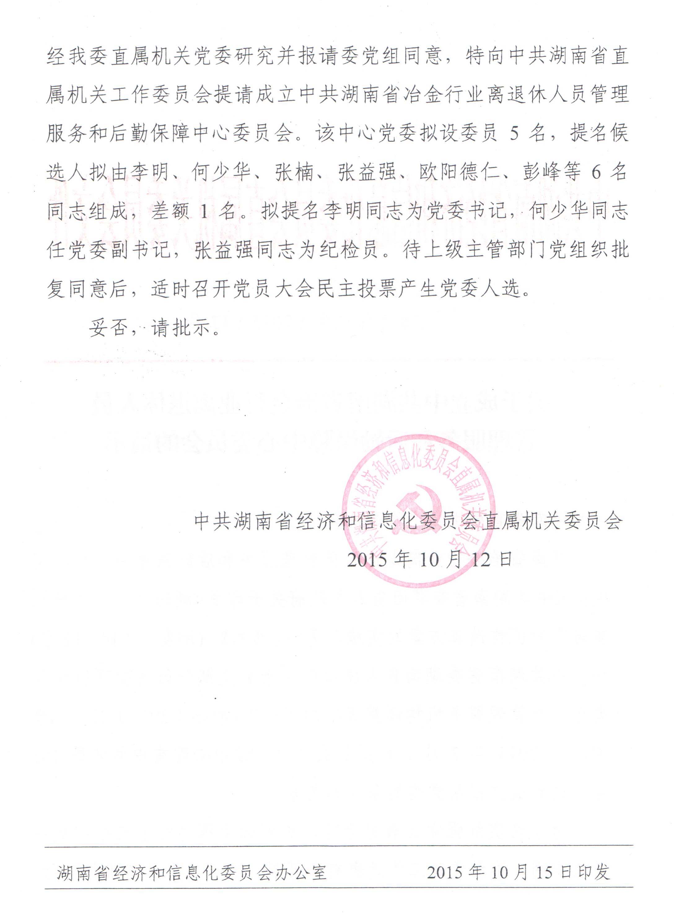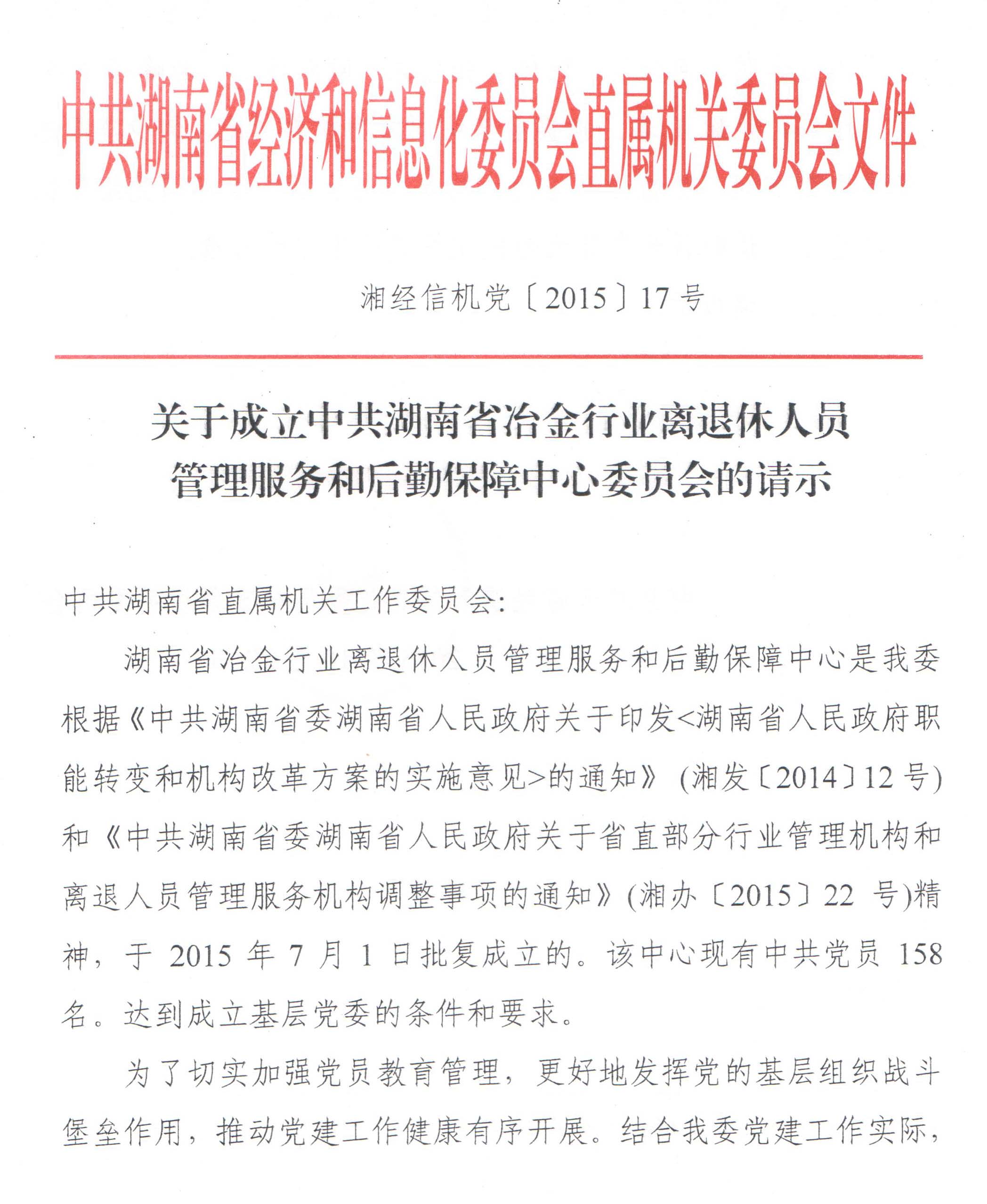 关于成立中共湖南省冶金行业离退休人员管理服务和后勤保障中心委员会的...