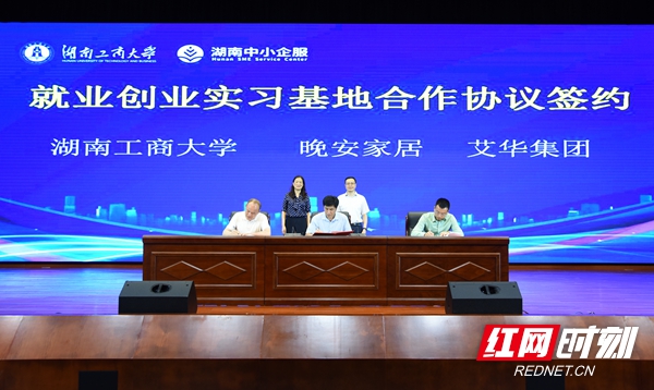 为建立校企合作长效机制,省中小企业服务中心、晚安家居、艾华集团、时代金属、飞沃新能源5家单位分别与湖南工商大学签署合作协议。