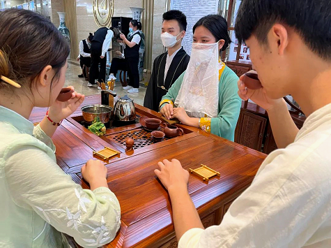 旅游管理学院在茶艺表演现场,学生们身着飘逸的传统服饰,向观众展示着他们的艺术修养和茶艺技能,让广大师生在茶艺文化的熏陶中近距离地领略和感受中国文化的博大精深。“调和、勾兑、搅拌...”管理专业的学生们用娴熟的调酒技巧为前来品酒的同学们调制酒水,通过现场的花式炫技让师生更直观地感受调酒的乐趣,品味鸡尾酒文化,展现职教魅力。