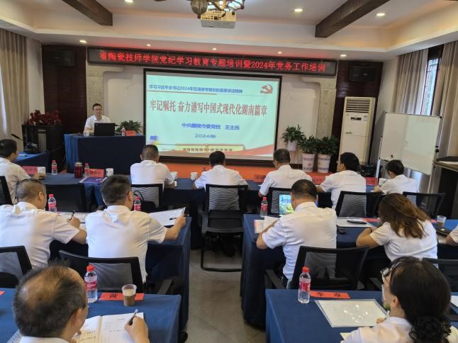 此次培训邀请了株洲市党员教育培训师资库教师、株洲市水利局机关党委专职副书记、工程师肖丽霞作党务工作专题培训,邀请了醴陵市委党校原副校长王主民作《牢记嘱托 奋力谱写中国式现代化湖南篇章》党课培训。党委副书记、院长陈湘伟作《切实把“六大纪律”铭刻于心 见效于行》的专题党课。培训课程结束后,纪检监察室开展了二季度党风廉政建设暨反腐败工作专题会议。会上,党委书记陈玲开展党风廉政建设专题党课,并提出工作要求,纪检监察室主任管祥久结合学院实际情况作专题汇报。