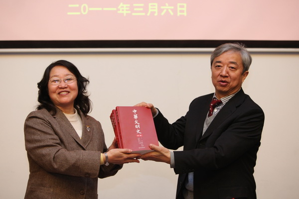 随后,北京大学继续教育部副部长张虹向谢超英主任赠送了北京大学的科研成果著作《中华文明史》予以纪念。