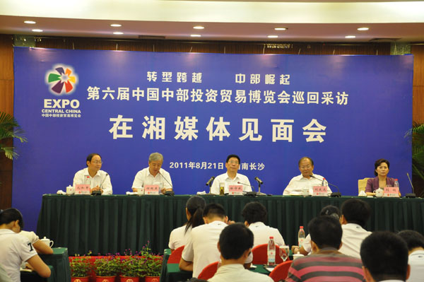 8月21日下午,第六届中国中部投资贸易博览会巡回采访在湘媒体见面会在长沙举行。中共湖南省委副书记、省长徐守盛出席见面会并介绍湖南经济社会发展以及与中部各省交流合作等情况并回答了记者提问,省经信委主任谢超英、省商务厅副厅长刘权现场回答了部分记者的相关问题,会议由湖南省政府新闻办主任孔和平主持,湖南省人民政府副秘书长刘庆选参加了会议。会后,省经信委主任谢超英还接受了安徽电视台、河南电视台、湖北卫视等媒体的现场采访。