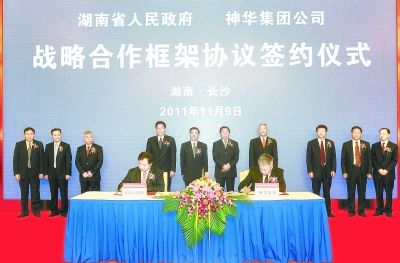 11月9日上午,省政府与神华集团有限公司在长沙签署战略合作框架协议。根据协议,“十二五”期间,神华集团将在湘投资300亿元左右,合作共建煤炭储备(中转)基地、电力及其它相关产业项目,加大对我省电煤的保供力度。省委书记、省人大常委会主任周强,神华集团董事长、党组书记张喜武,省委副书记、省长徐守盛出席签约仪式并讲话。