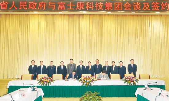 8月26日下午,省人民政府与富士康科技集团在长沙举行会谈并签署《湖南省人民政府 富士康科技集团关于实施“绿色照明工程”战略工作框架协议》。省委书记、省人大常委会主任周强,省委副书记、省长徐守盛,台湾“中华文化总会”会长刘兆玄,富士康科技集团总裁郭台铭出席会谈或见证签约。