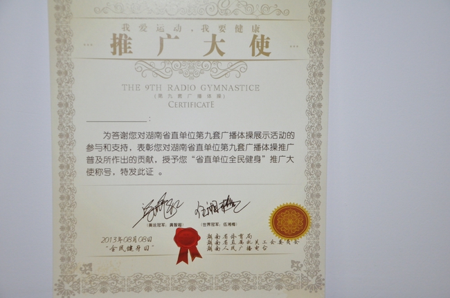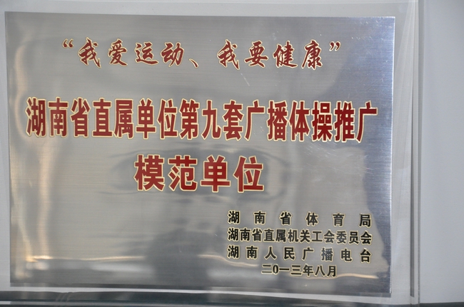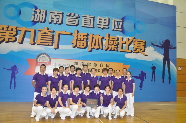为进一步促进《全民健身计划纲要》和委机关“工间操”制度的贯彻落实,增强干部职工的身体素质和健身意识,带动大家积极参与全民健身活动, 8月7日至8日,机关工会组队参加了省直单位第九套广播体操比赛暨全民健身推广展示活动。我委荣获“湖南省直属单位第九套广播体操推广模范单位”奖和最佳组织奖,刘虎、苏 电、郭 凤、聂 霞、宋 虹、崔莉萍、刘珍芳、周碧蓉、许文琳、杨红宇、唐野萍、易 慧、陈 念、何彦红、王新玲、杨兰娟、刘 平、欧 柳、易永彤、罗卫宁、鄢 彬、颜佳等22人荣膺“我爱运动,我要健康”推广大使称号。