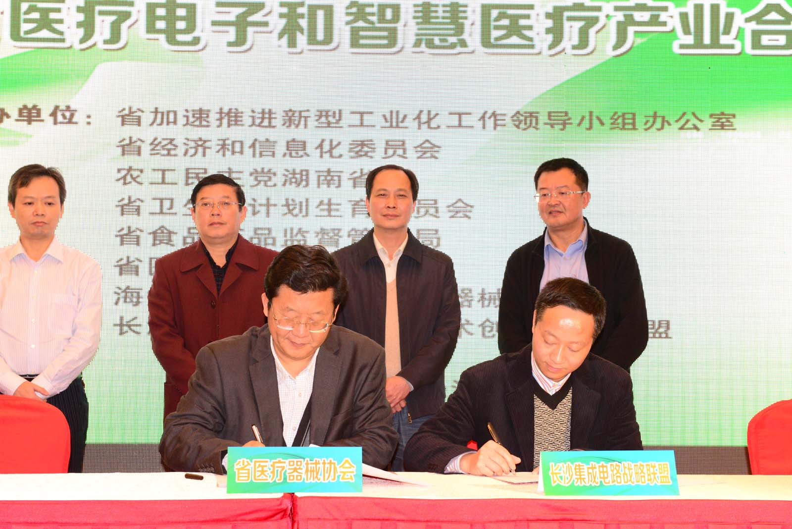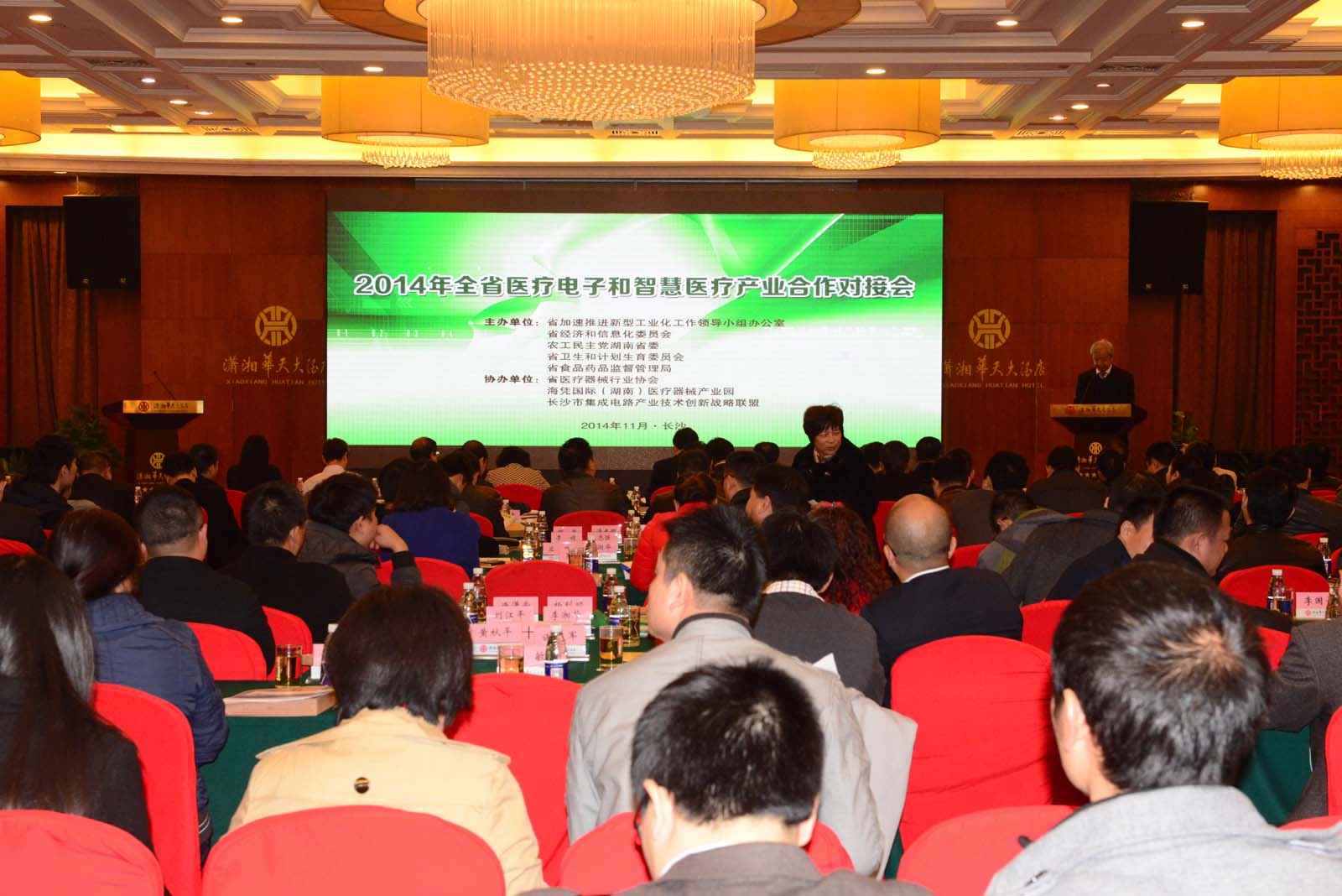 11月26日,2014年全省医疗电子和智慧医疗产业合作对接会在长沙召开。对接会由省加速推进新型工业化工作领导小组办公室、省经济和信息化委员会、农工党湖南省委、省卫生和计划生育委员会、省食品药品监督管理局等单位联合举办。会议旨在通过政府主管部门的“牵线搭桥”,促进和加强我省医疗电子企业和医疗卫生机构之间互动交流,增强行业了解,推进省内产需的对接与合作。省内140多家医疗卫生机构、近百家医疗电子及相关企业参加会议。