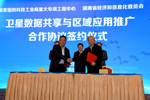 国家国防科技工业局、湖南省人民政府、中国航天科工集团有限公司,湖南省有关厅局、各市州经信委,湖南省重点高校及有关企事业单位代表共120余人共同见证了《卫星数据共享与区域应用推广合作协议》的签署和高分湖南中心的揭牌。