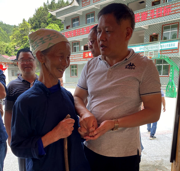 77岁的潘夕姣老人,依依不舍的握着工作队员的手。这几年她家在工作队的帮扶和自身的努力下,建起了新房,用上了卫生厕所,过上了美好生活。