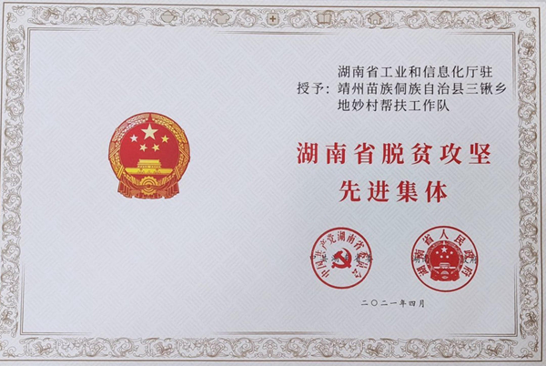 湖南省工业和信息化厅驻三锹乡地妙村帮扶工作队获评“湖南省脱贫攻坚先进集体”