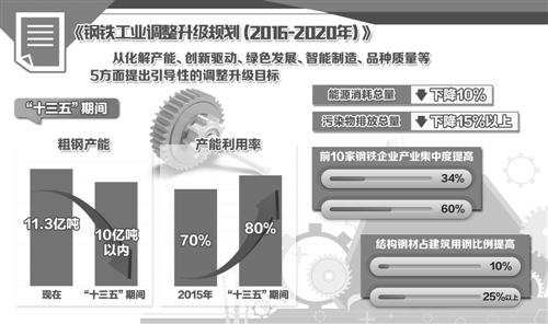 工业和信息化部11月13日表示,将于近日发布《钢铁工业调整升级规划(2016-2020年)》(以下简称《规划》),围绕“到2020年钢铁工业供给侧结构性改革取得重大进展,实现全行业根本性脱困”的总体目标,从化解产能、创新驱动、绿色发展、智能制造、品种质量等5方面提出了引导性的调整升级目标。