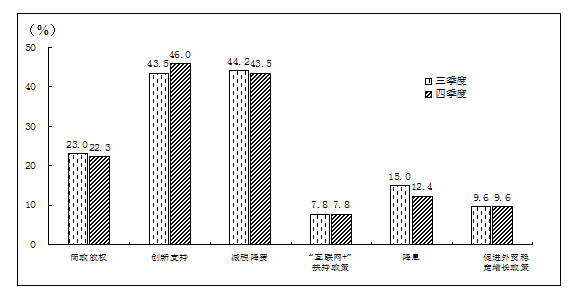 四季度,在上述2.3万家受益优惠政策的企业中,受益创新支持和减税降费政策的企业比例最高,分别为46.0%和43.5%,明显高于其他选项;与上季度比较,创新支持政策惠及面提高2.5个百分点,减税降费略降0.7个百分点。受益简政放权政策的企业比例居第三位,为22.3%,比上季度略降0.7个百分点。