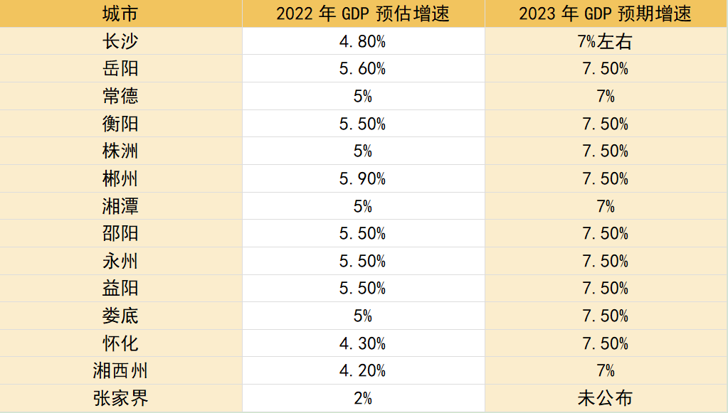 看GDP:长沙从4.8%到7%左右,岳阳从5.6%到7.5%,衡阳从5.5%到7.5%,湘潭从5%到7%……在2个百分点左右。