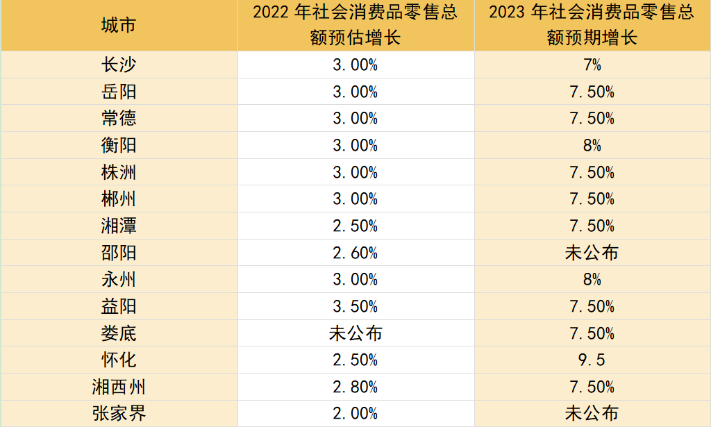看社会消费品零售总额,长沙从3%到7%,岳阳从3%到7.5%,衡阳从3%到8%,湘潭从2.5%到7.5%……最少也增长4个百分点。
