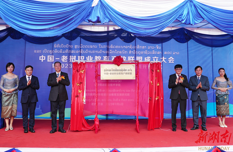 △9月6日,毛伟明与老挝教育与体育部部长普·西玛拉翁一起为中老职业教育产教联盟揭牌。