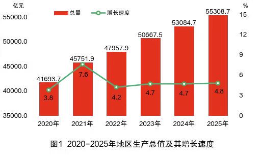 2025年是“十四五”规划收官之年,湖南努力加快高质量发展步伐,全省经济运行总体平稳、顶压前行、质效向好。地区生产总值达55308.7亿元,同比增长4.8%,人均地区生产总值84888元、增长5.4%,三次产业结构优化为9.0:36.0:55.0,在产业升级、民生改善、区域发展、生态保护等方面涌现出诸多亮点。