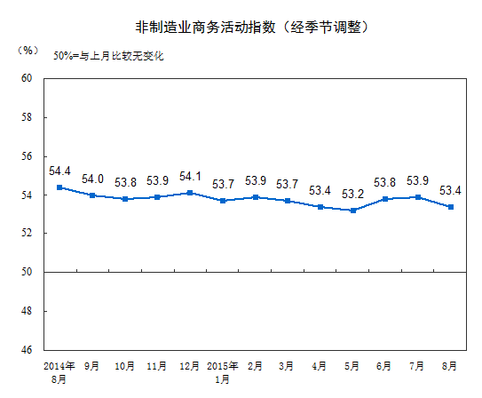 2015年8月份,中国非制造业商务活动指数为53.4%,比上月回落0.5个百分点,仍高于临界点3.4个百分点,表明我国非制造业总体继续保持稳定增长态势。