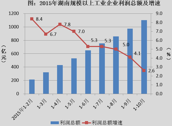 1-10月,湖南规模以上工业企业累计实现主营业务收入27056.64亿元,同比增长5.8%;盈亏相抵后实现利润1100.31亿元,增长2.6%,比1-9月回落1.5个百分点,增幅在全国排第11位,在中部六省中排第4位。每百元主营业务收入中的成本为84.78元,主营业务收入利润率为4.07%。