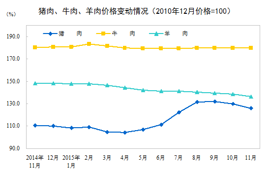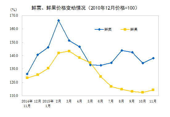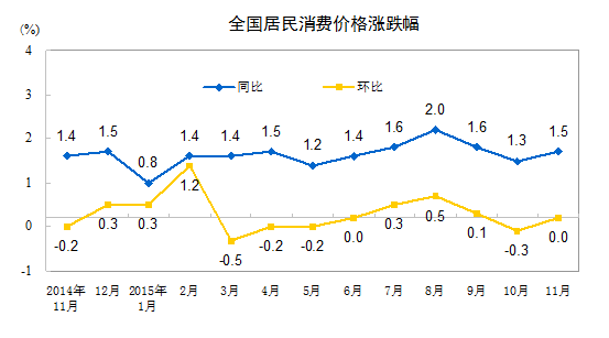 2015年11月份,全国居民消费价格总水平同比上涨1.5%。其中,城市上涨1.5%,农村上涨1.3%;食品价格上涨2.3%,非食品价格上涨1.1%;消费品价格上涨1.2%,服务价格上涨2.1%。1-11月平均,全国居民消费价格总水平比去年同期上涨1.4%。