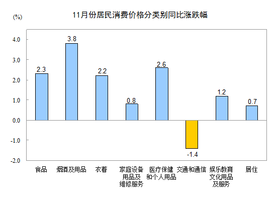 11月份,非食品价格同比上涨1.1%。其中,烟酒及用品、医疗保健和个人用品、衣着、娱乐教育文化用品及服务、家庭设备用品及维修服务、居住价格分别上涨3.8%、2.6%、2.2%、1.2%、0.8%和0.7%;交通和通信价格下降1.4%。