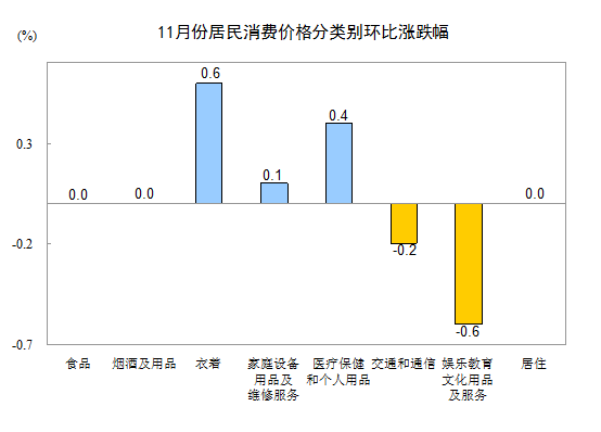 11月份,全国居民消费价格总水平环比持平。其中,城市、农村均持平;食品、非食品价格均持平;消费品价格持平,服务价格下降0.1%。
