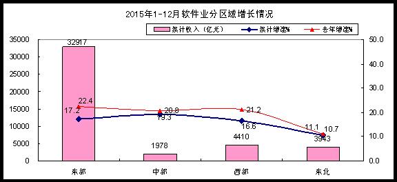 1-12月快报显示,东部地区完成软件业务收入3.29万亿元,同比增长17.2%,增速比1-11月提高0.6个百分点,低于2014年5.2个百分点。西部地区完成软件业务收入4410亿元,同比增长16.6%,增速比1-11月下降0.6个百分点,低于2014年4.6个百分点。中部地区完成软件业务收入1978亿元,同比增长19.3%,增速比1-11月提高0.4个百分点,低于2014年1.5个百分点。东北地区完成软件业务收入3943亿元,同比增长10.7%,增速低于全国平均水平5.9个百分点。
