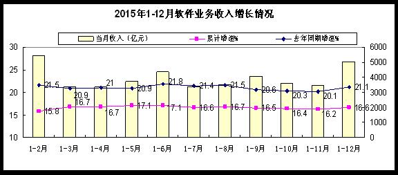 2015年1-12月快报显示,我国软件和信息技术服务业共完成软件业务收入4.3万亿元,同比增长16.6%,增速低于2014年4.5个百分点,但比1-11月提高0.4个百分点。