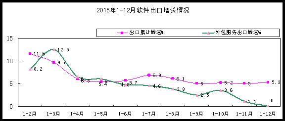 1-12月快报显示,软件业实现出口545亿美元,同比增长5.3%,增速比2014年提高1.6个百分点,比1-11月提高0.3个百分点,但仍低于全行业收入增速11.3个百分点。其中外包服务出口额与去年同期基本持平,增速比1-11月回落1.1个百分点。嵌入式系统软件出口增长4.2%,增速比1-11月回升0.2个百分点。